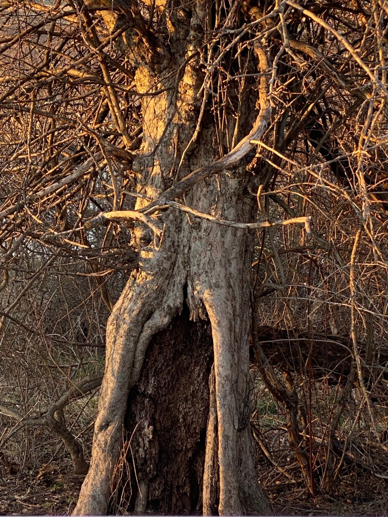 This particular specimen was more robust at one time, but has always been one of my favorites. Over the years the center has hollowed out. I’ve seen squirrels, rabbits, and chipmunks take refuge in the opening at the bottom and there are always chirping warblers cavorting in its branches. During the fall, mushrooms near the base made a tasty snack for deer.